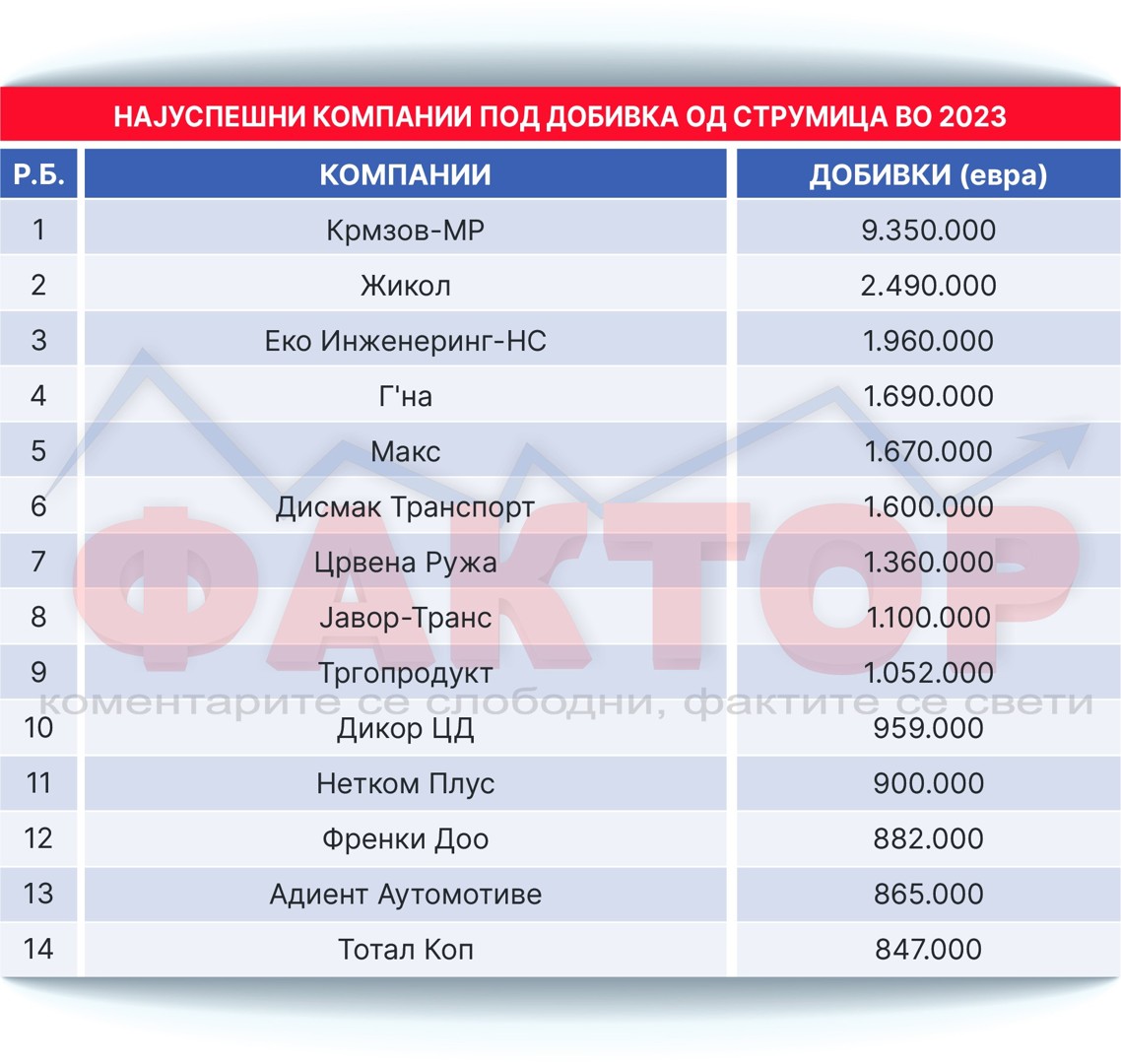 На листата се уште Макс Струмица за зачини, Нетком Плус за продажба на текстил на големо, Френки Доо за трговија на големо на храна и пијалоци и Адиент Аутомотиве од слободната индустриска зона за производство на технички текстил.