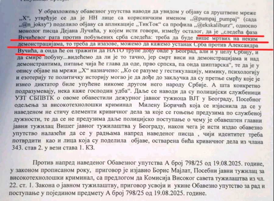 Главниот обвинител на ВЈТ Белград, Ненад Стефановиќ, издаде задолжителна инструкција за постапување според законот. Борис Мајат, обвинителот на специјалното одделение на Вишото јавно обвинителство во Белград, односно одделението за високотехнолошки криминал, поднесе приговор.
