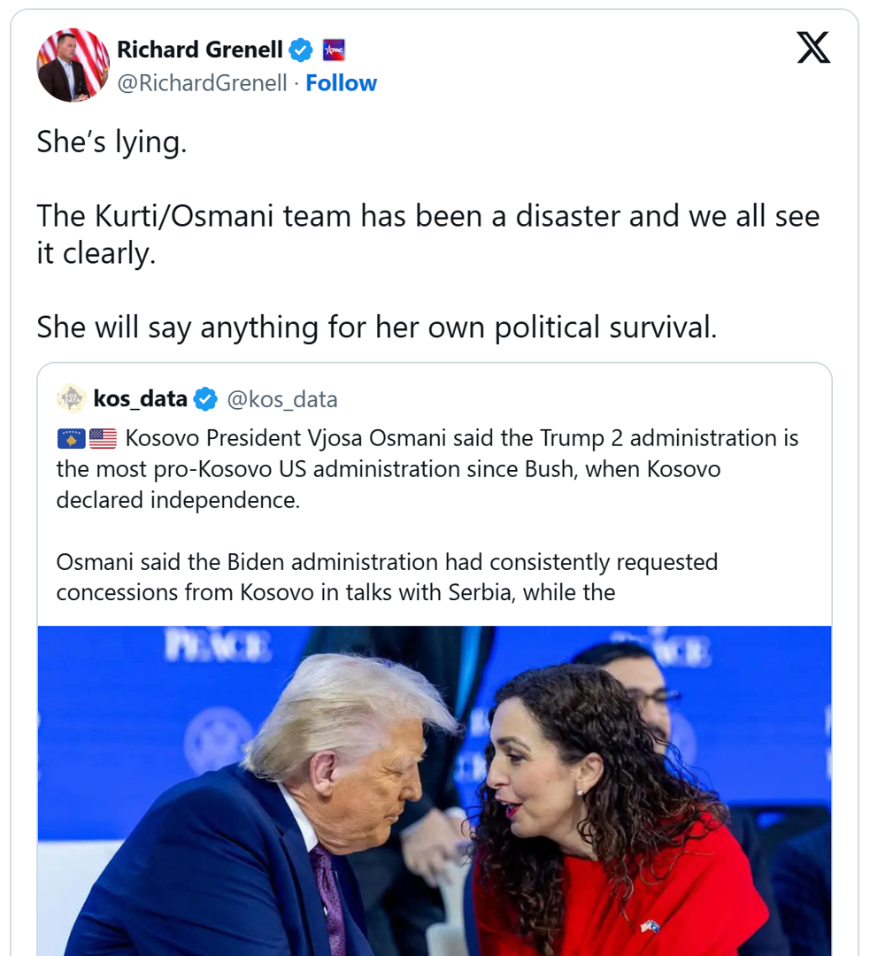 „Таа лаже. Тимот Курти-Османи беше катастрофа и сите можеме јасно да го видиме тоа. Таа ќе каже апсолутно сè заради сопствениот политички опстанок“, одговори претставникот на американскиот претседател за специјални мисии, Ричард Гренел.