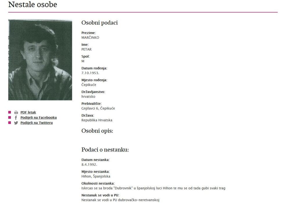 Последната информација за него била во април 1992 година, кога како 39-годишник тргнал со бродот Дубровник во Хихон, Шпанија и оттогаш му се губи секаква трага.