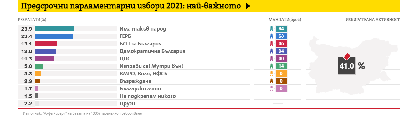 Партијата на Слави Трифонов „Има таков народ“ го зголеми водството во однос на втората политичка сила ГЕРБ на Бојко Борисов, покажуваат податоците на „Алфа рисрч“ на 100 отсто паралелено пребројување. Резултатите покажуваат дека „Има таков народ“ добива 23,9 отсто од гласовите, коалицијата ГЕРБ-УДФ има половина процент помалку - 23,4 проценти. Сепак разликата е многу мала и уште ништо не ејасно. Дали ова ќе биде разрешница на политичката криза не може да се предвиди со сигурност.