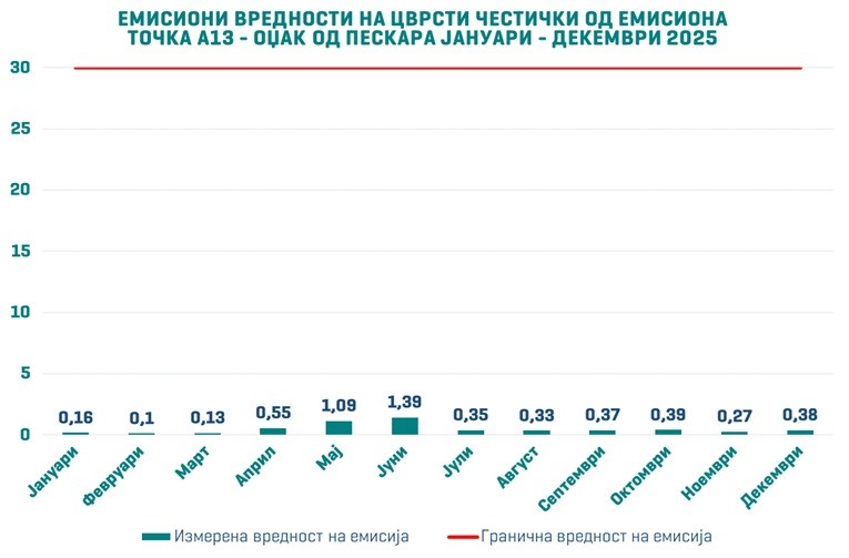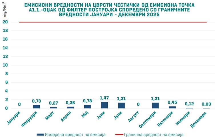 Според редовниот мониторинг на емисиите, кој се спроведува согласно методологии за мерење на стационарни извори, измерените вредности на цврсти честички за месеците октомври, ноември и декември 2025 година покажуваат конзистентно исклучително ниски вредности, кои се во согласност со одредбите од А-интегрираната еколошка дозвола издадена од Министерството за животна средина и просторно планирање, како и релевантната законска легислатива.
