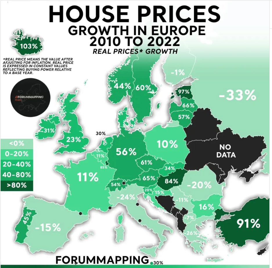 Највисок раст на цените на станбените недвижности во периодот од 2010 до 2025 година е забележан во Унгарија 277 проценти и Естонија 250 проценти, а цените се дуплираа или повеќе во десет други земји-членки, Литванија, Латвија, Чешка, Португалија, Бугарија, Австрија, Луксембург, Полска, Словачка и Хрватска.