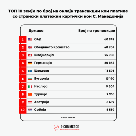Дополнуваат дека останатите земји од каде што има најголем број на онлајн трансакции доминантни се оние земји каде има голем број на иселеници, како Швајцарија, Германија и Шведска кои ги користат своите платежни картички за да купуваат онлајн од е-продавници од Северна Македонија.