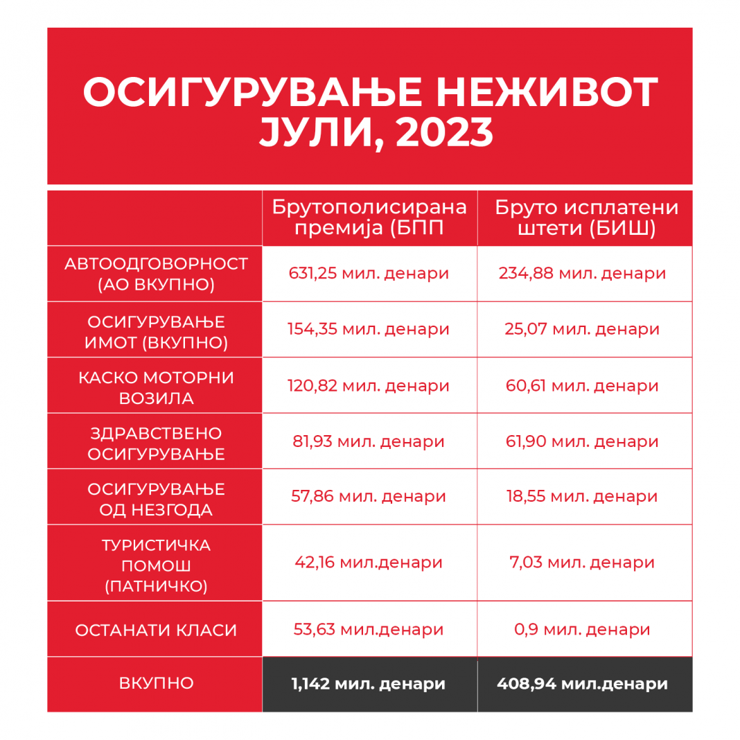 Вкупно во јули сите компании на неживотно осигурување исплатиле 409 милиони денари (6,65 мил.евра)) за штети покриени со договори за осигурување. Износот на исплатени штети е зголемен за 26 отсто во споредба со истиот месец во 2022 година. Зголемување во однос на истиот период лани има и кај бројот на исплатени штети за 19,5 отсто. Во јули годинава се исплатени вкупно 10.848 оштетни побарувања за штети покриени со неживотно осигурување.