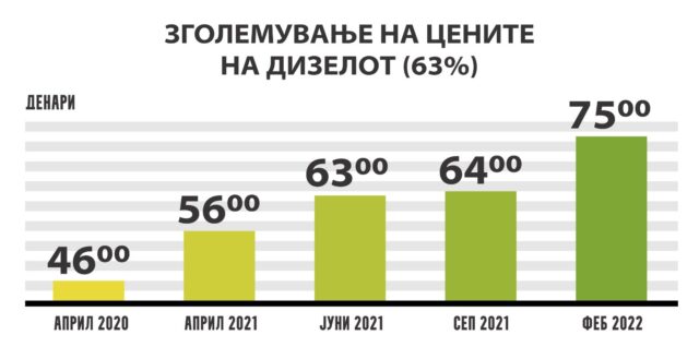 Во април 2020 година дизелот се продавал по цена од 46 денари, април 2021 година цената била 56 денари, а денес истиот се продава по цена од 75 денари, покачување од 63%.