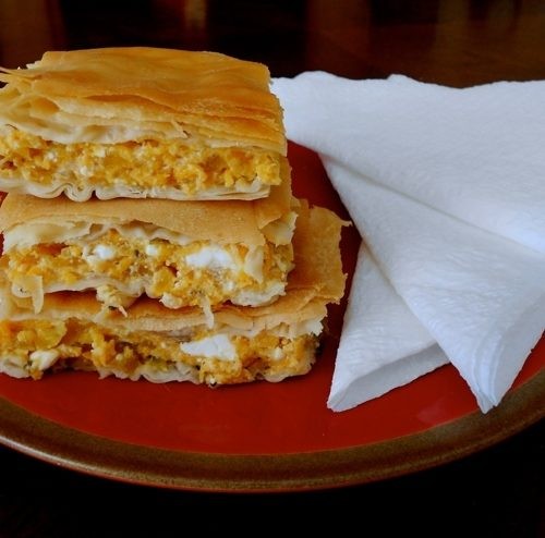 Направете фил од печена тиква, рикота или фета сирење, додадете јајце, малку павлака и зачини по вкус. Сето ова ставете го во тенко растегнато лиснато тесто или домашно тесто и печете додека не добие златна боја.