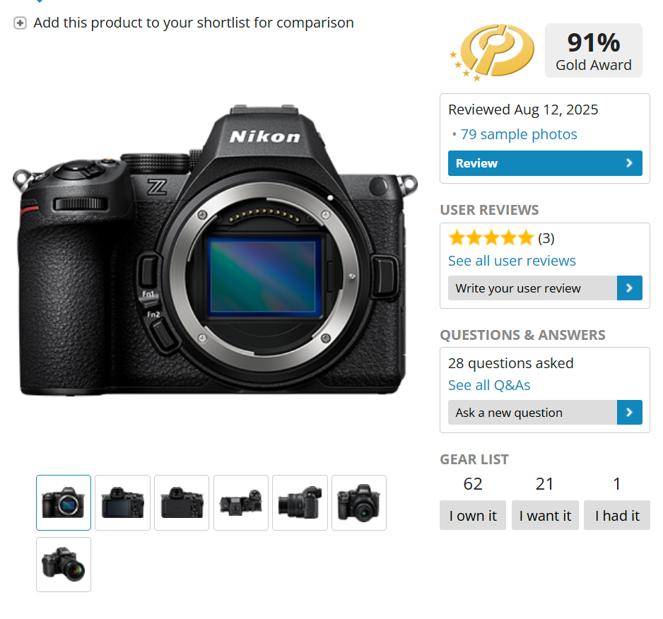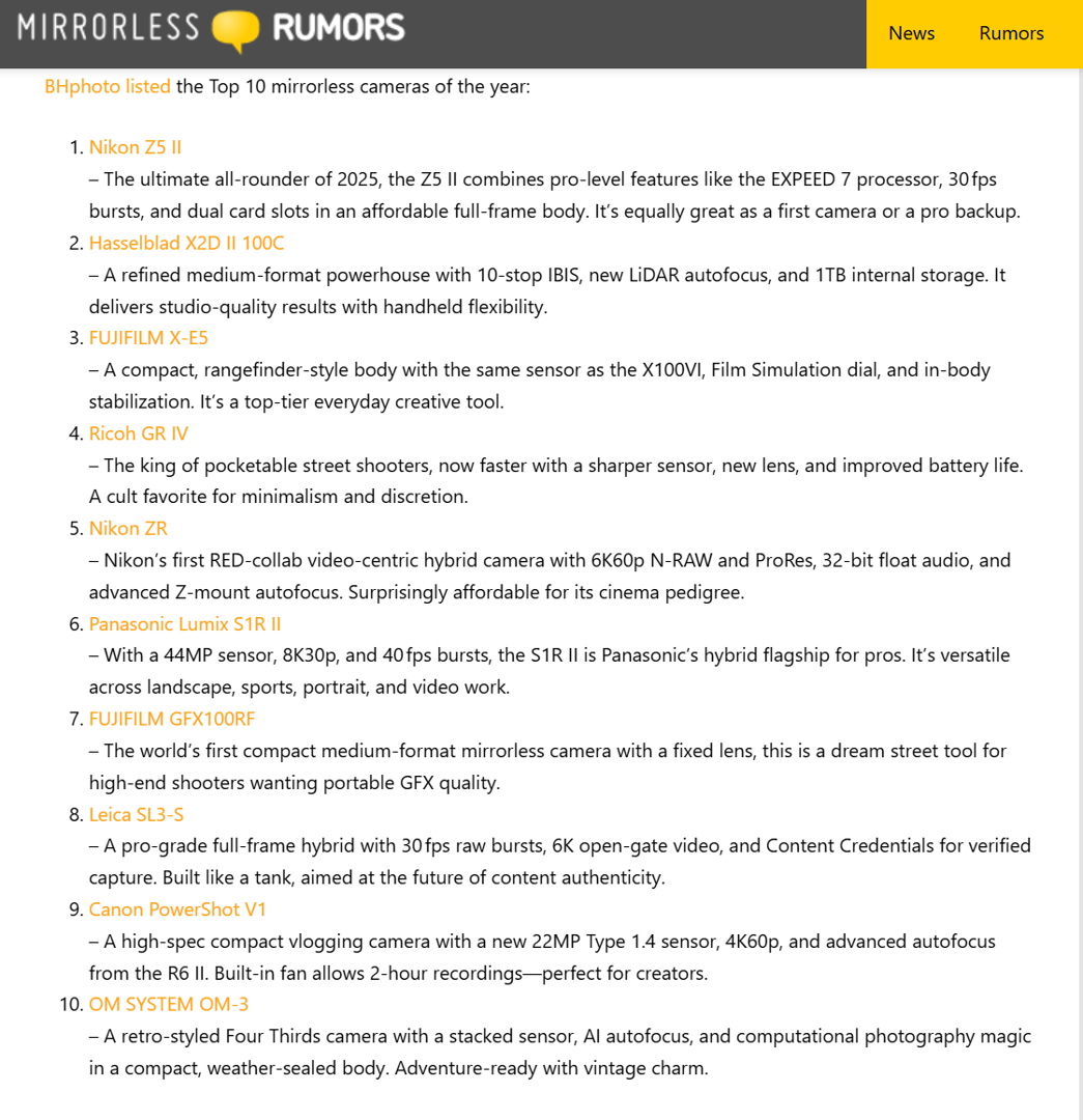 Престижниот сајт за фотото камери во светот, mirrorlessrumors.com избра 10 најдобри фото камери за 2025-та година, меѓу кои на прво место се наоѓа Nikon Z5II, а втора фотокамера според рејтингот е Hasselblad X2D II 100C која е три пати поскапа од Nikon Z5II. Еве ја целата рејтинг листа: