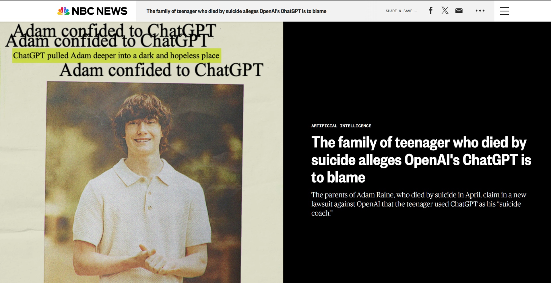 Според неговите родители, Адам го користел четботот во последните недели како замена за човечко друштво, доверувајќи му се за својата вознемиреност и проблеми. Транскриптите од разговорите, велат тие, покажуваат како улогата на ботот постепено се променила - од помагање со домашните задачи до она што го нарекуваат „тренер за самоубиства“.