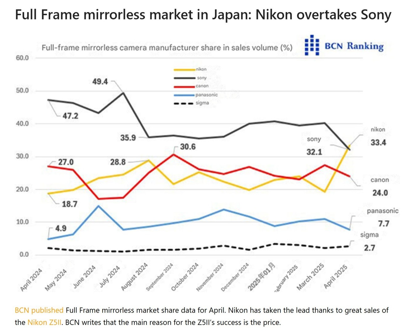 По неколку врвни модели, она што го турна Никон на врвот овој пат беше лансирањето на новиот производ „Z5II“. Иако беше објавен на 25 април, кон крајот на месецот, ги престигна конкурентите со силна брзина и освои месечен удел од 33,4%. Се искачи на врвот.