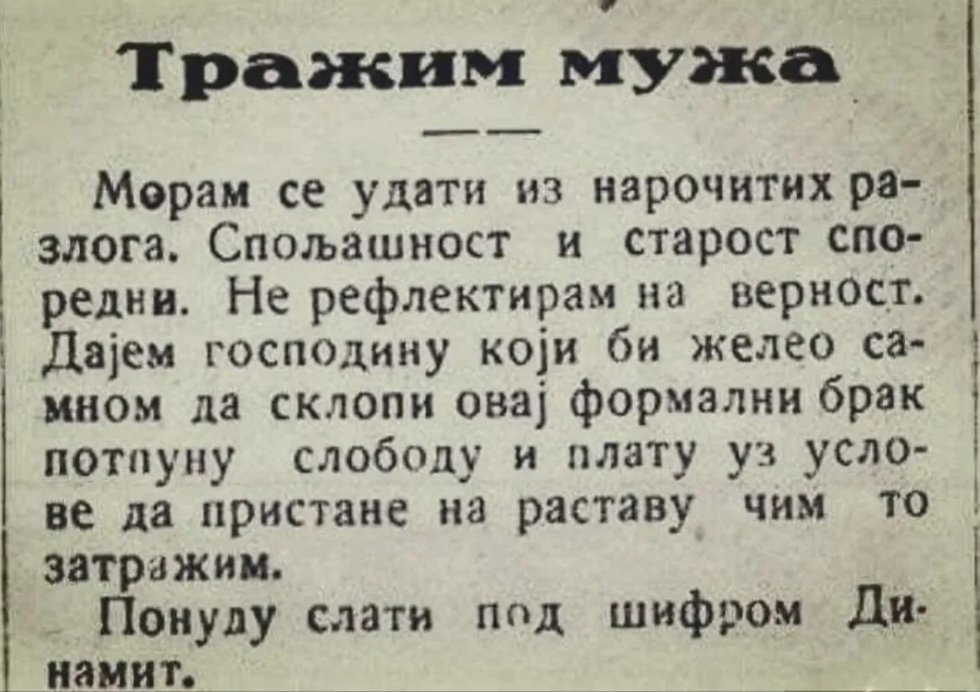 - Барам сопруг. Морам да се оженам од посебни причини. Изгледот и возраста се второстепени. Не размислувам за верноста. На господинот кој сака да склучи овој формален брак со мене му давам целосна слобода и плата со услов да се согласи на разделба штом ќе го побарам тоа. Испратете ја понудата под кодот „Динамит“ - се вели во интересен оглас од минатиот век.