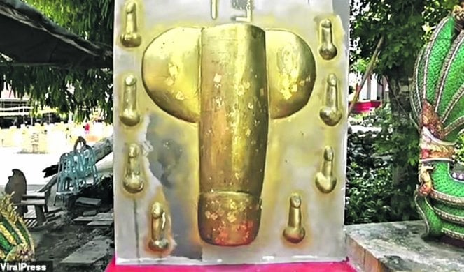На него има релјеф на машкиот полов орган во злато, а околу него осум мали пениси, исто така во злато. Мажи, будистички верници, сега доаѓаат кај олтарот да се молат.