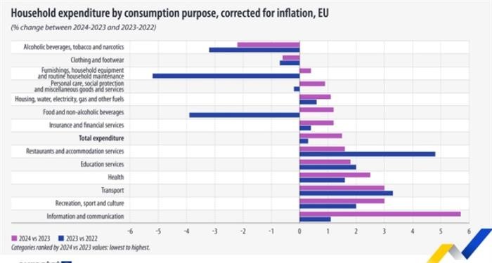 Растот на трошоците за „ресторани и услуги за сместување“ на домаќинствата во ЕУ во 2024 бил 1,6 проценти и ова е единствената групација каде се бележи значително намалување на издвојувањата во споредба со претходната година, кога тие бележеа раст од речиси пет отсто.