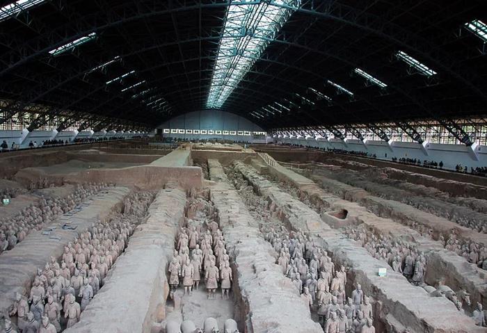 Последователните ископувања открија низа јами со илјадници воени статуи од теракота во природна големина во облик на војници и воени коњи. Се чини дека оваа војска од теракота служела како заштитници на мавзолејот на Ќин Ши Хуанг, првиот кинески цар.