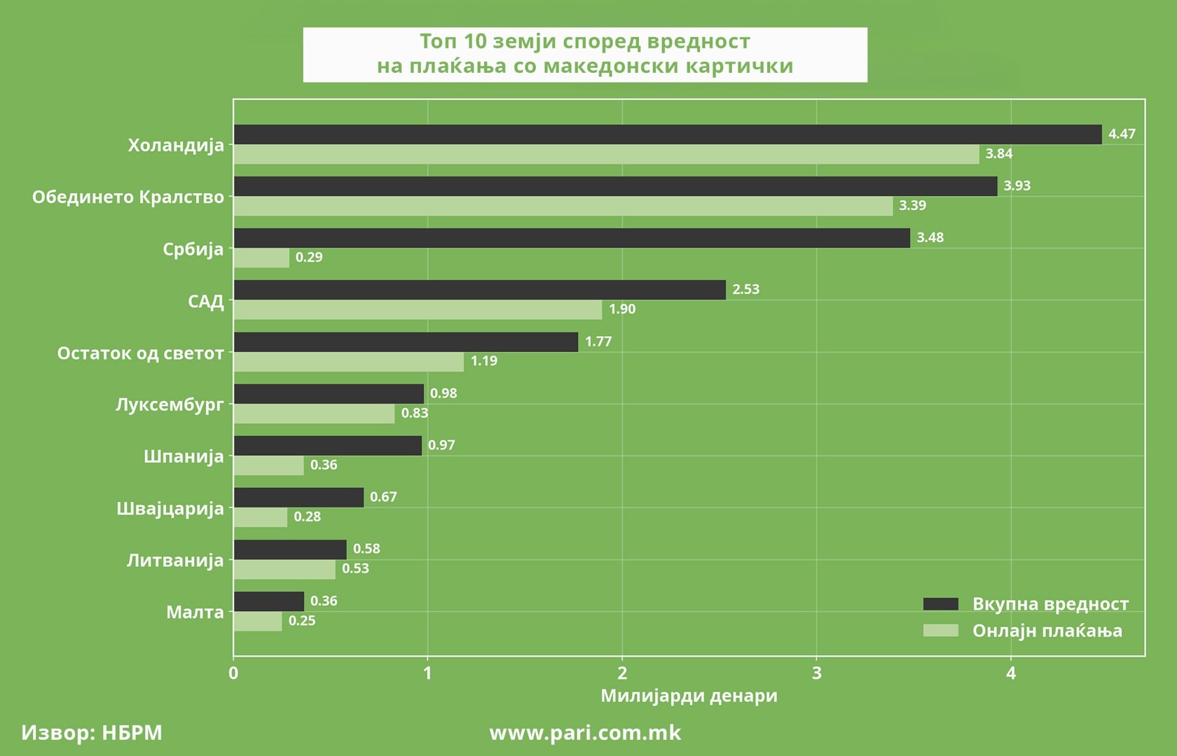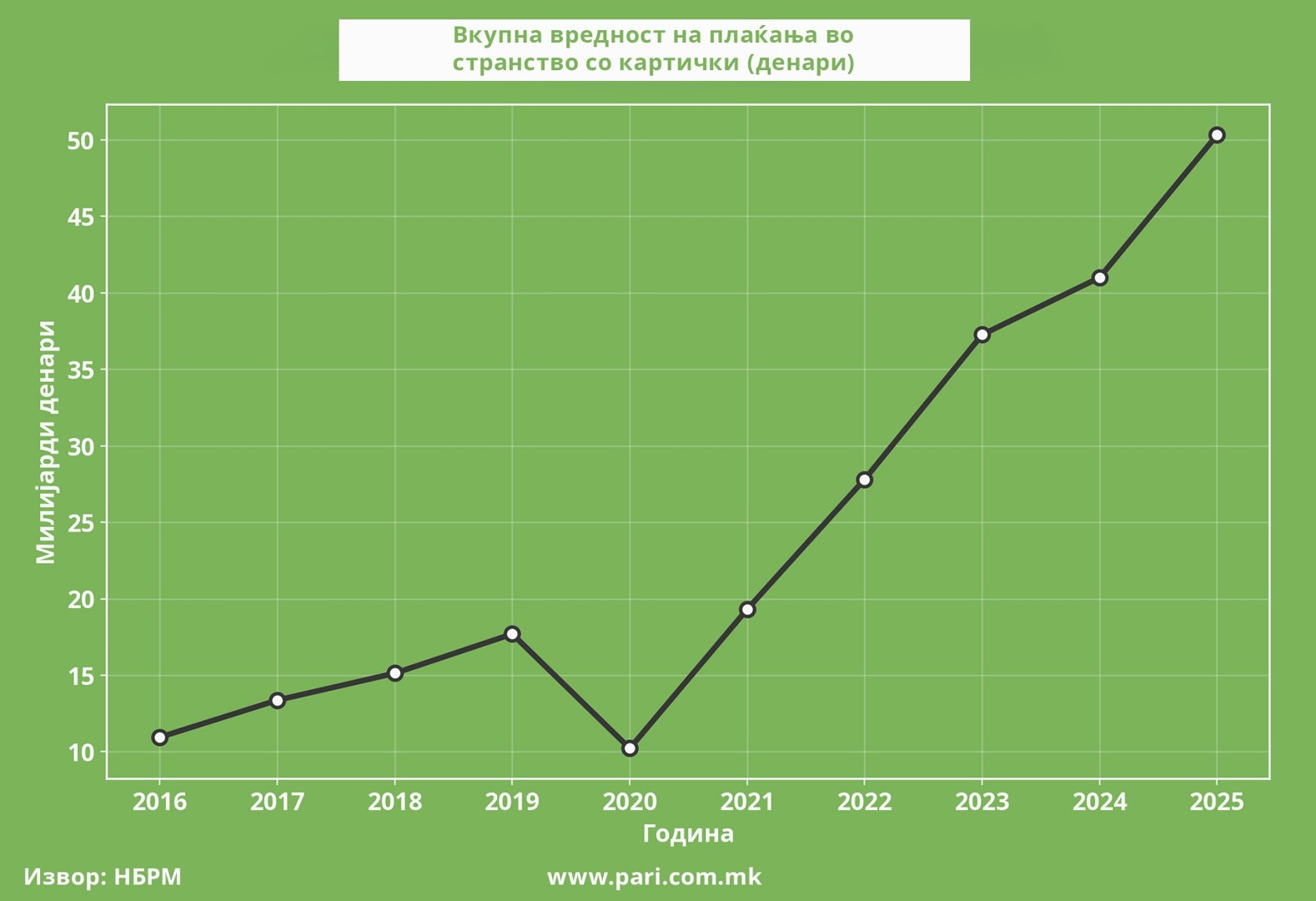Вкупната вредност на трансакциите со картички во странство бележи годишен раст од над 9,3 милијарди денари (151,5 милиони евра), односно за 22 насто, што е најголем раст во последната деценија. Пари ги анализираше податоците на Народната банка, од кои произлезе дека клучниот двигател е е-трговијата, која бележи раст од околу 52 насто, односно дополнителни 8,8 милијарди денари (143,4 милиони евра) во споредба со 2024 година.