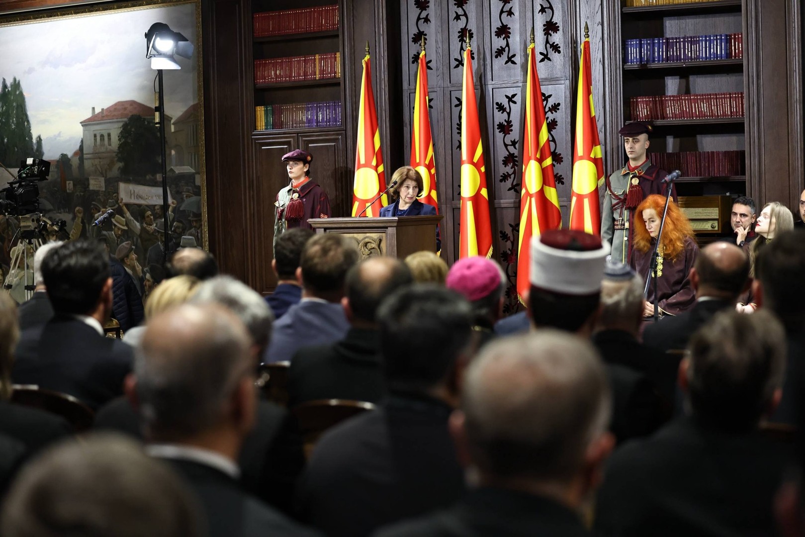 Пред нас е задачата да ја спречиме фрагментацијата на македонското општество со тоа што одново ќе ги научиме доблестите коишто ја одржуваат заедницата. Како и во Климентово време и нам ни е потребна заедничка, повисока цел, околу која ќе градиме односи и ќе премостуваме разлики. Преку владеење на правото и борба против корупцијата, преку социјална правда и заемна грижа да го обновиме општествениот договор на слободни граѓани, еднакви пред законот, сплотени околу општото добро, порача во обраќање претседателката Гордана Сиљановска-Давкова на Свечената академија по повод државниот празник „Св. Климент Охридски“, која вечерва се одржа под незјино покровителство.