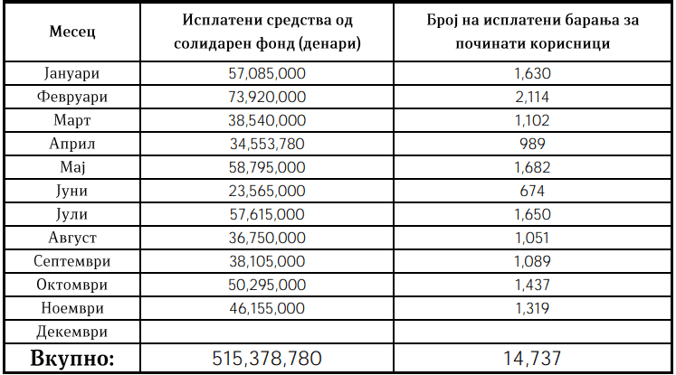 Во текот на ноември, во Солидарниот фонд се уплатени 9.923.280 денари (161,3 илјади евра). Истиот месец посмртнина е исплатена на 1.319 семејства во износ од 46.155.000 денари, односно 750,5 илјади евра.