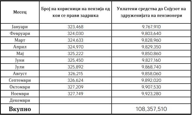 Во 11 месеци од 2025 година вкупно се уплатени 108.357.510 денари, или 1,76 милиони евра, додека исплатите достигнале 515.378.780 денари, што е противвредност од 8,38 милиони евра. Овие средства ги добиле 14.737 семејства на починати корисници на пензија.