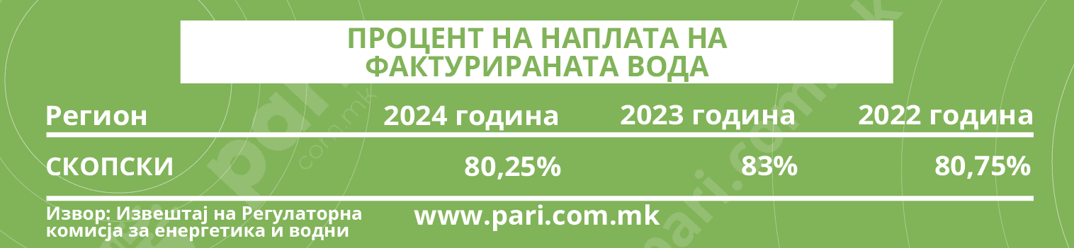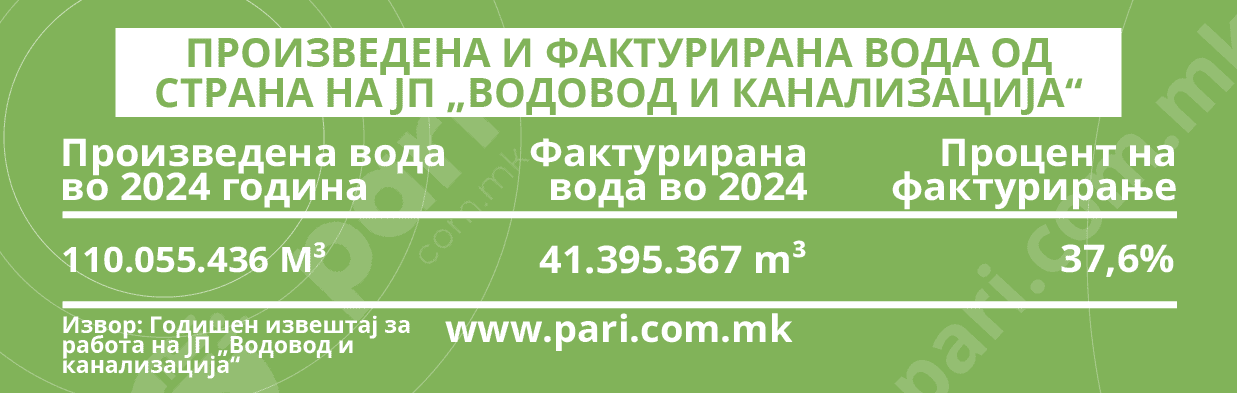 „Претпријатието во текот на 2024 година има произведено вкупно 110.055.436 м³ вода од двете изворишни подрачја Рашче 1 и Рашче 2, како и од бунарските подрачја Лепенец и Нерези. Од вкупно произведените, кон своите корисници има фактурирано 41.395.367 m³“, пишува во Извештајот на ЈП Водовод и канализација – Скопје за 2024 година. Математички, ова значи дека е фактурирана одвај малку повеќе од една третина од произведената вода, или точно 37,6 отсто. А, и оваа фактурирана вода не е целосно наплатена.