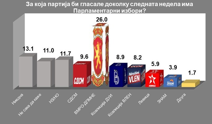 На прашањето „За која партија би гласале доколку следната недела има Парламентарни избори?“ 26 проценти од испитаниците рекле дека ќе гласаат за ВМРО-ДПМНЕ“, 9,8 проценти за опозициската СДСМ, 8,9 проценти за Коалиција ДУИ, 8,2 проценти за Коалиција ВЛЕН, 5,9 проценти за Левица, 3,9 проценти за ЗНАМ, а 1,7 проценти за друга партија. За ниедна партија нема да гласаат 13, 1 процент, а 11 проценти од испотаниците не сакале да кажат, додека 11,7 проценти рекле дека не знаат или немаат одговор.