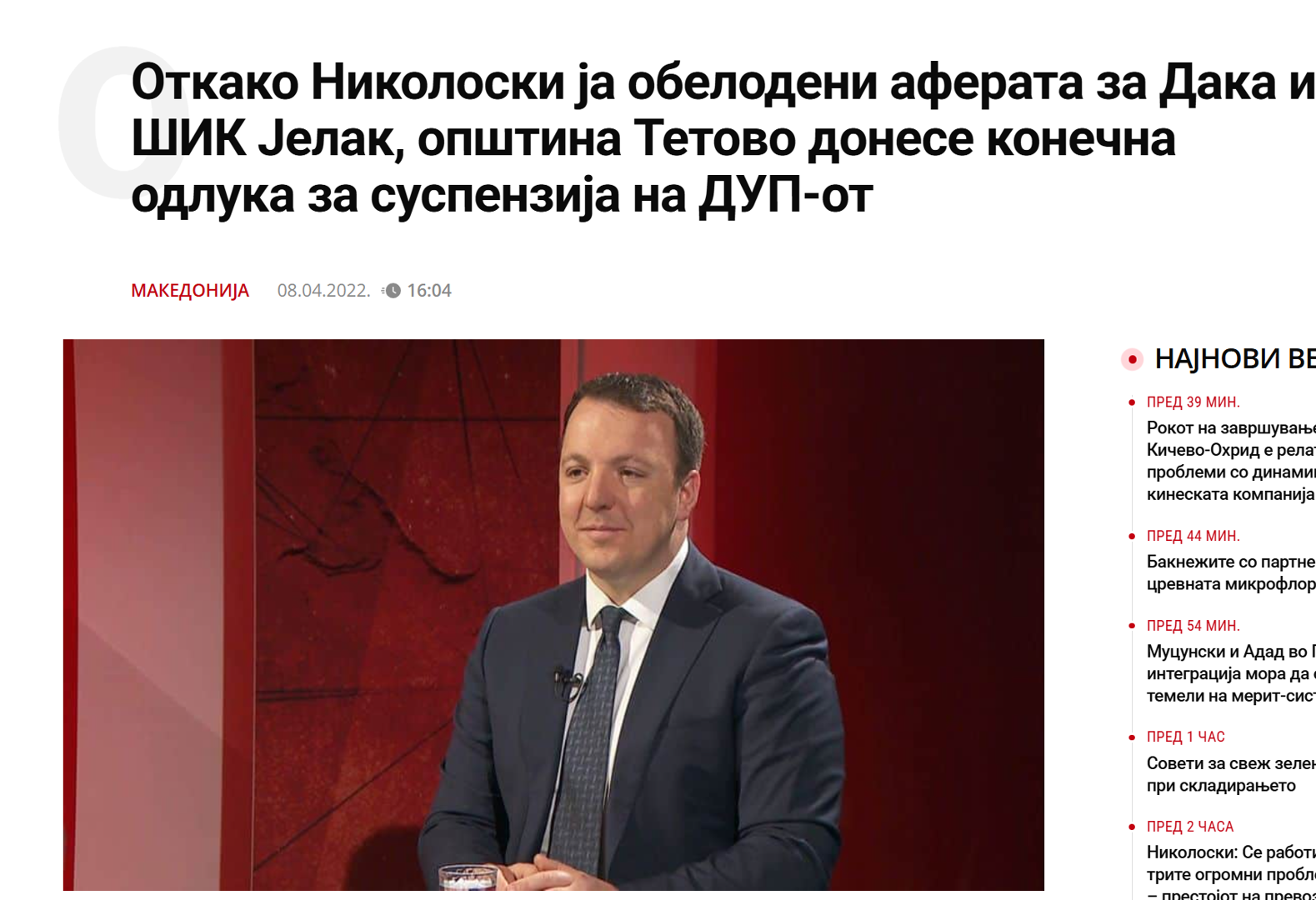 Како поткрепа на овој став, министерот потсети на неговиот ангажман од 2020 година кога прв ја отвори аферата за „Шик Јелак“ во Тетово. Николоски наведе дека тоа бил првиот зелен детален урбанистички план усвоен по тогашните парламентарни избори и додаде дека токму тој случај бил причината зошто Теута Арифи не заминала за амбасадор во Вашингтон. Вицепремиерот заклучи дека стои зад секој збор кажан во опозиција и дека нема да се дозволи изградба на каков било објект поврзан со споменатиот бизнисмен или неговите компании.