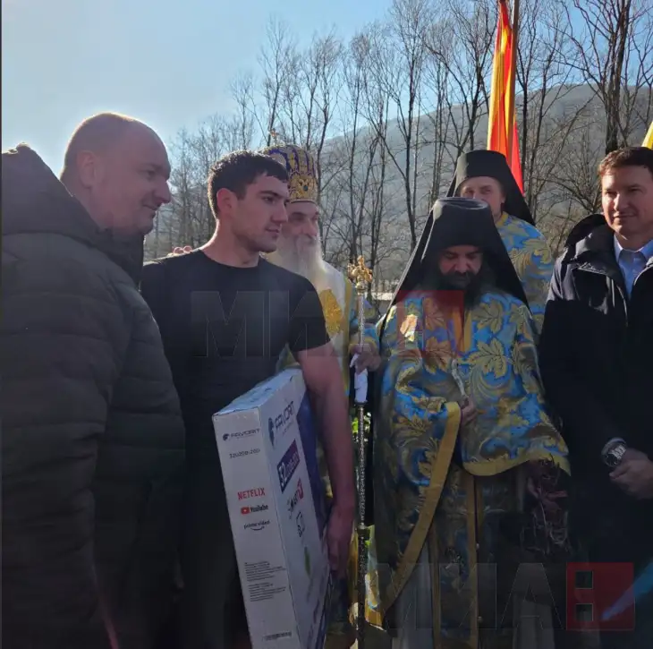 Дваесет и тригодишниот Милко Божиновски од Ростуше го извади осветениот крст од водите на Радика, што беше положен од епископ Антаниски, г. Партениј, по повод денешниот голем христијански празник Богојавление – Водици.