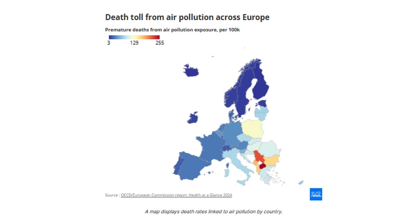 Повикувајќи се на извештај на Европската комисија и Организацијата за економска соработка и развој (ОЕЦД), Euronews пишува дека најпогодена од загадувањето на воздухот е Северна Македонија, а по неа е Србија.