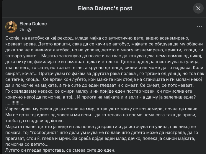 Вознемирувачка сцена се случила на автобуската станица кај „Рекорд“ во центарот на Скопје, кога млада мајка со своето аутистично дете се соочила со сериозна криза, а наместо помош од присутните граѓани, добила потсмев и навреди.