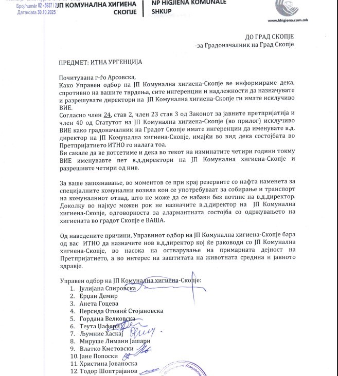 Управниот одбор на ЈП „Комунална хигиена“ ѝ пиша итна ургенција на Арсовска во која наведува дека само таа има ингеренции и надлежности да назначи нов директор на претпријатието.