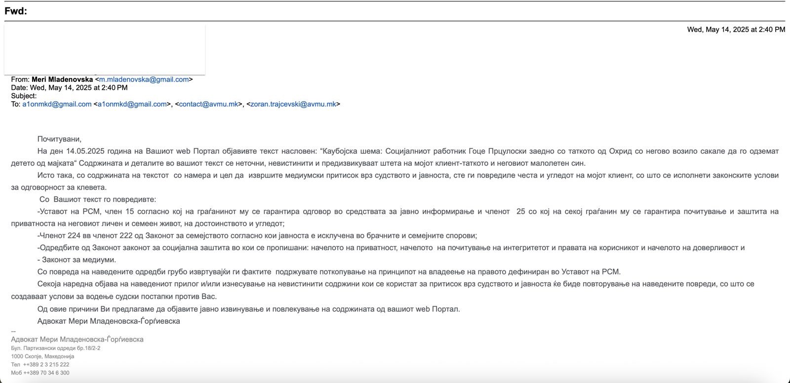 До поратлот А1он.мк упатено е писмо со опомена пред тужба од страна на адвокатката Мери Младеновска Ѓорѓиевска, како и од посоченото лице, социјален работник, во Центарот за социјална работа за кого се објавени клевети до ниво на кафански муабети но, во тешко пијана состојба. Порталот го води кадар на Ацо Кабранов, познат по својата скандалозност и од ТВ А1, а особено како уредник на телевизијата на Боки 13 - 1ТВ и, со тоа се е објаснето.
