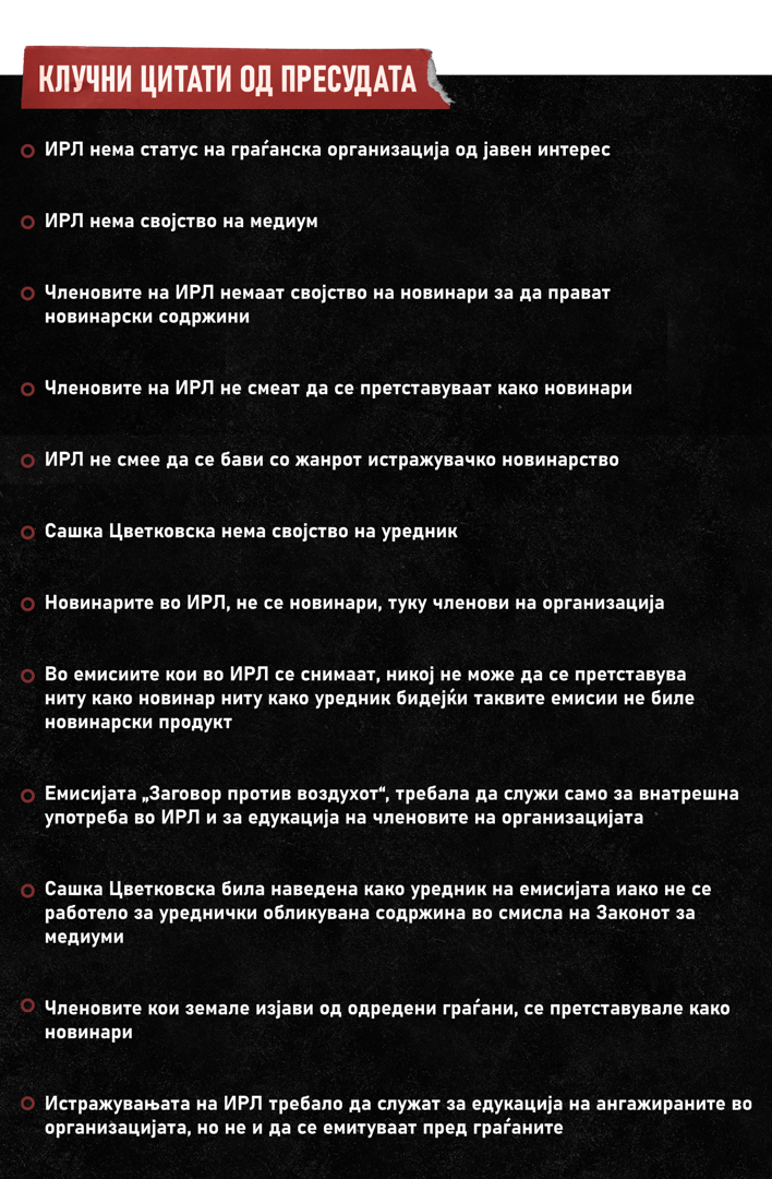 „ИРЛ и Сашка Цветковска се правосилно осудени за клевета направена кон Кочо Анѓушев за нивната емисија за увоз на токсичен мазут и загадување на воздухот.“