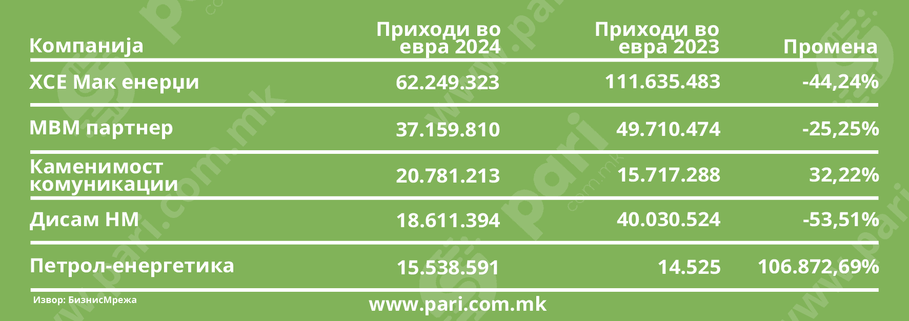 Првото место со приход од 62,2 милиони евра го зазема ХСЕ Мак енерџи. Во 2023 година приходите ѝ биле за 44,24 насто поголеми, т.е. во износ од 111,6 милиони евра. Инаку, фирмата основана во 2009 година е во сопственост на Холдингот Словенски електране д.о.о. Љубљана.