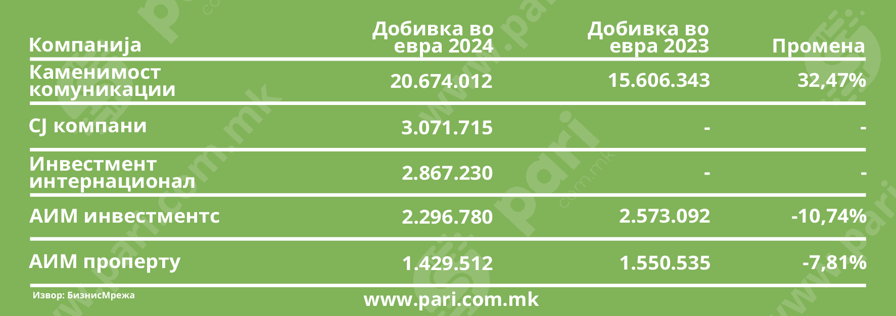 Најголемиот дел, или 20,6 милиони евра, се на сметката од Каменимост комуникации. Споредено со 2023 година, чистата заработка е поголема за 32,47 насто. Иако е прва по профит, Каменимост комуникации е трета по приход, за 32,22 насто повисок од преклани, а се брои со 20,78 милиони евра. Разликата меѓу приходите и добивката ги претставува годишните трошоци ‒ 107 илјади евра.