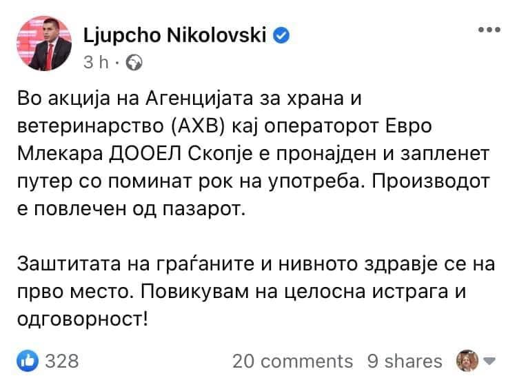 Според Николовски путерот бил пронајден во акција на Агенцијата за храна и ветеринарство (АХВ) кај операторот Евро Млекара ДООЕЛ