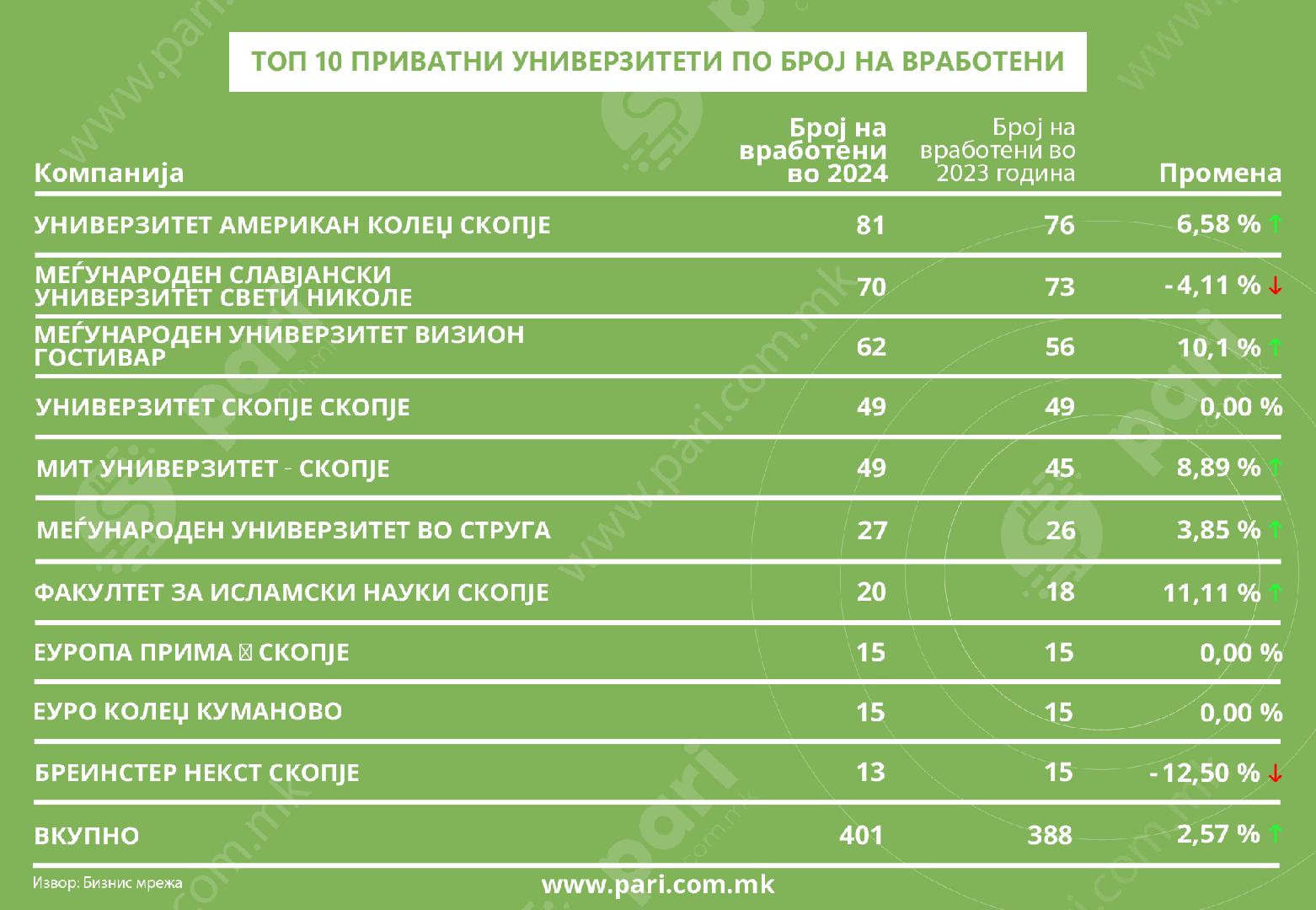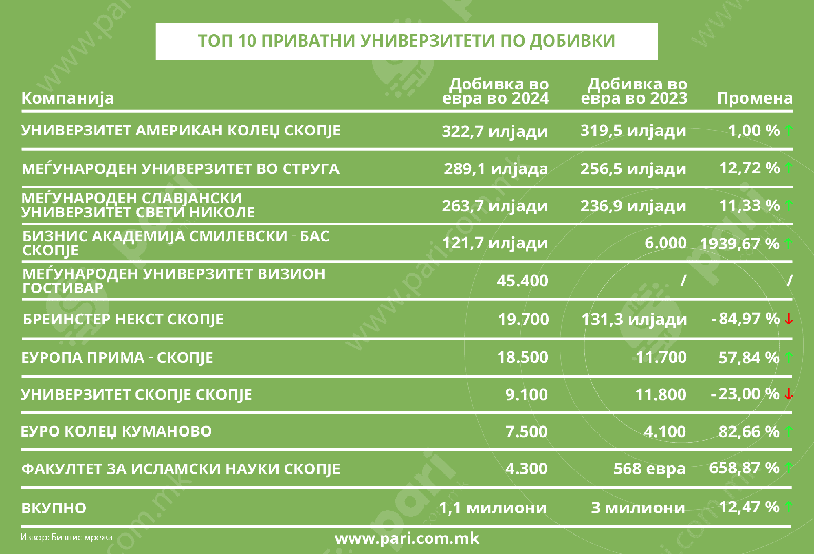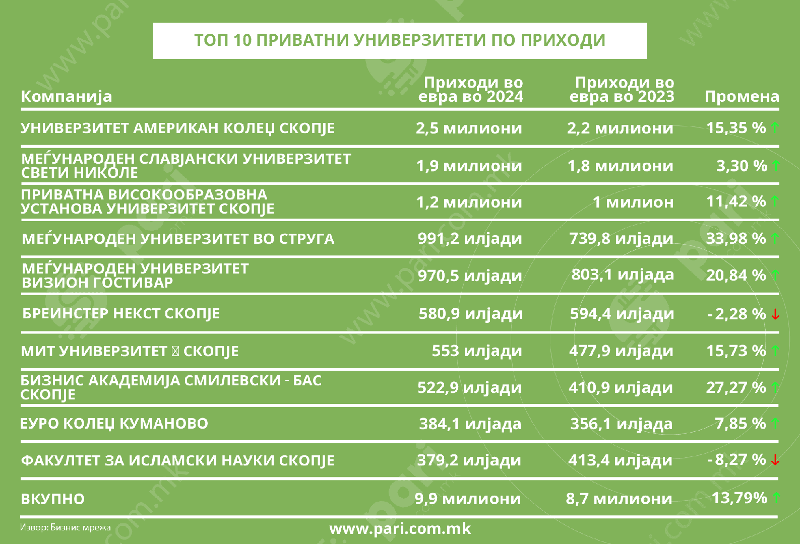 Во анализата на порталот Пари од податоците на Бизнис мрежа се опфатени податоци за 17 приватни универзитети, од кои 10 влегуваат во топ-листата по перформанс. Десетте со најголем промет во 2024 година оствариле вкупен приход од околу 10,3 милиони евра, додека десетте со највисока добивка имаат заеднички профит од околу 1,1 милион евра. Десетте најголеми работодавачи во групата ангажираат 421 вработен, а збирот на просечните месечни плати изнесува 6,8 илјади евра.