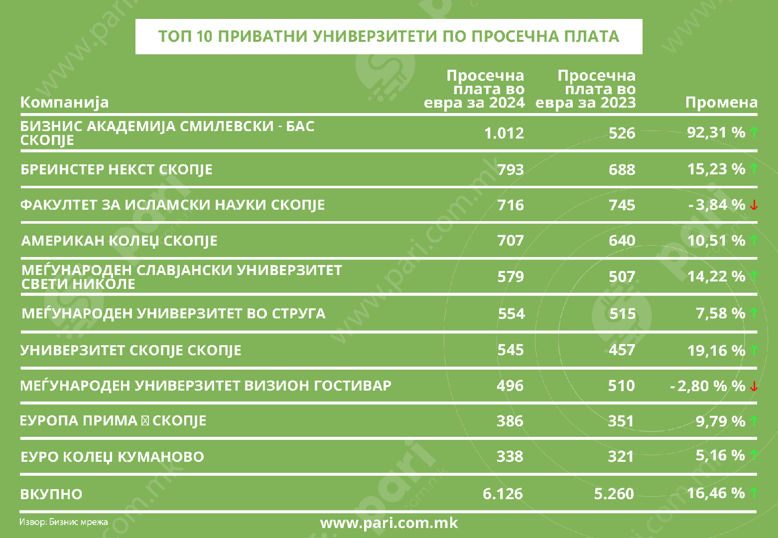 Во Македонија, за спомнатата 2024-та година, просечна месечна нето плата била 41.000 денари, или околу 660 евра. Кога се знае овој податок, се доаѓа до заклучок дека само четири приватни универзитети имале просечна месечна плата над тоа, а три од нив само малку над севкупниот македонски просек што е по малку неочекувано ако се знае дека на универзитетите работат доминантно луѓе со високи стручни квалификации и сериозни обврски и одговорност како и потреба од постојано дополнотилено усовршување.