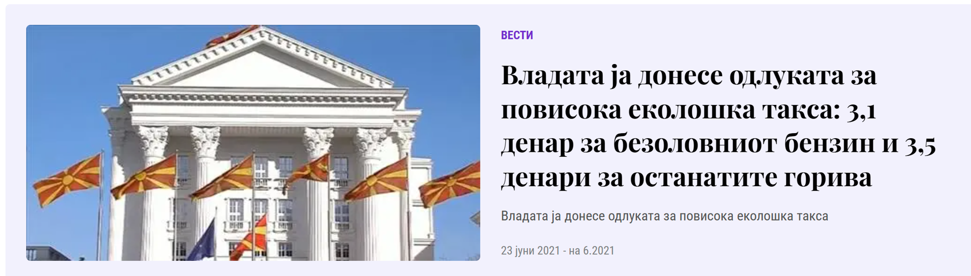 “Како што појаснуваат од прес-службата на Владата, со предложените измени се предвидува зголемување на еколошката такса, односно се предлага зголемување на давачката за увоз на нафтените деривати во земјата за 3,5 денари за моторен бензин со содржина на олово повисока од 0,013 г/л и за авионски бензин, гориво за дизел мотори, екстра лесно масло за горење и масло за горење М1, М2 (мазут), како и зголемување од 3,1 денар за моторниот безоловен бензин со содржина на олово до 0,013г/л како помалку загадувачки нафтен дериват во однос на останатите предвидени деривати...“ гласи одлуката на владата на СДСМ од јуни 2021 година
