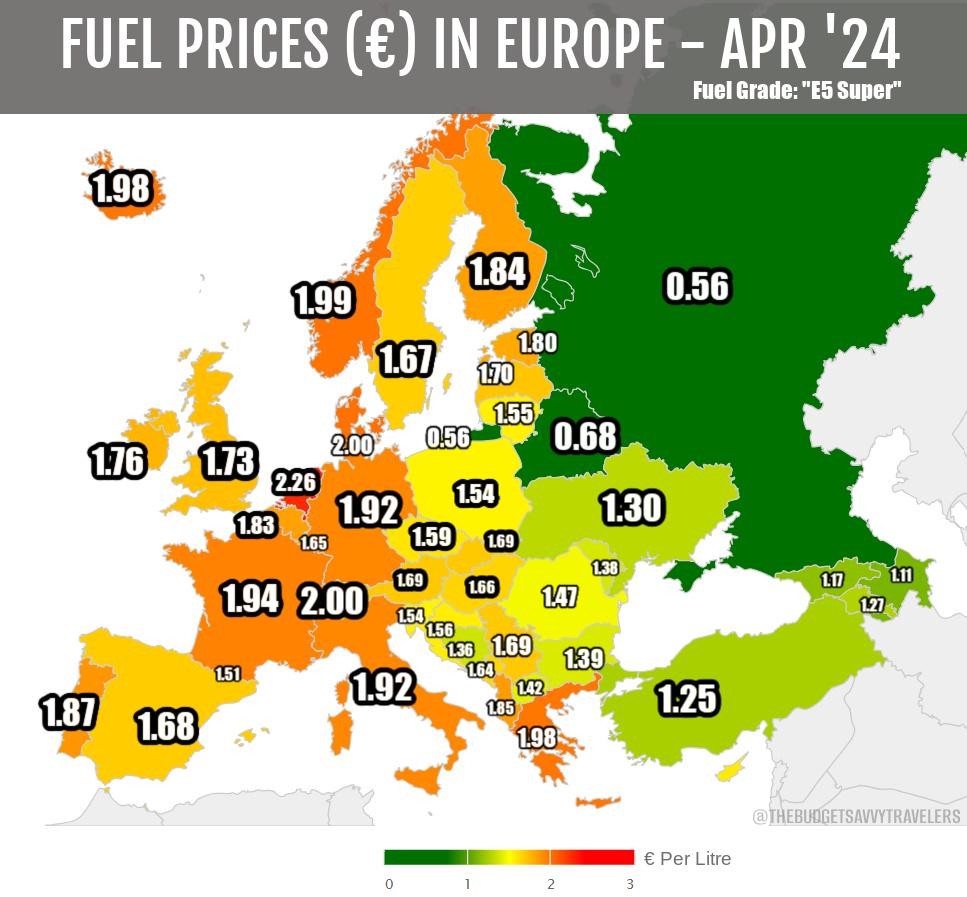 Според неделниот билтен за цените на нафтата на Европската комисија објавен на 2 април 2026 година, просечната цена на бензинот Euro-super 95 во ЕУ е 1,871 евра за литар, додека дизелот (гас) е 2,076 евра за литар. Овие цени ја одразуваат состојбата на 30 март.