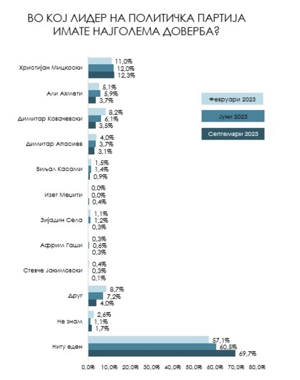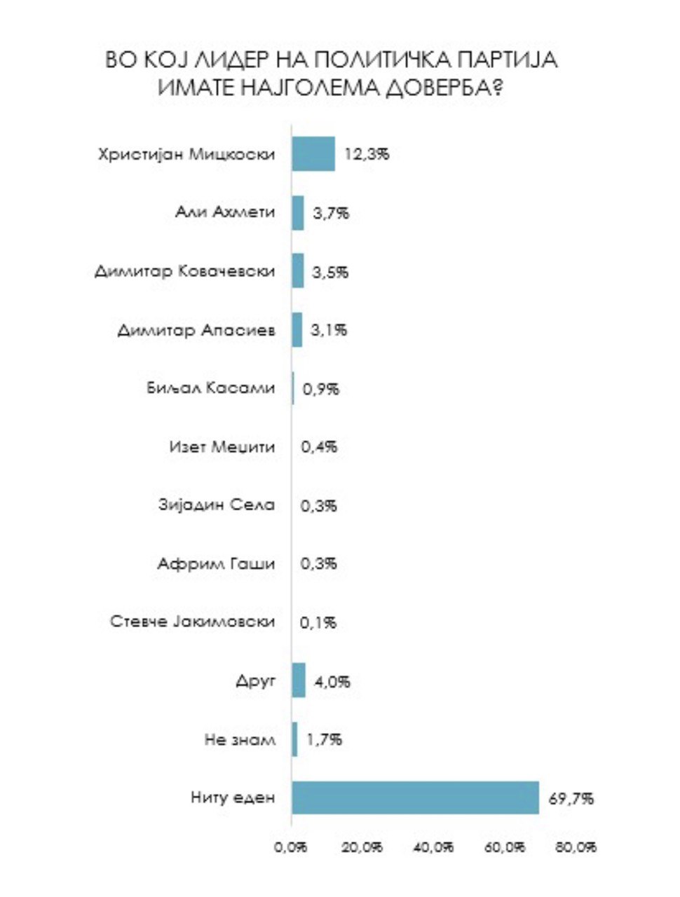 Над две третини или 69,7% од испитаниците немаат доверба во ниту еден лидер на политичка партија на македонската политичка сцена. Додека од оние кои се изјасниле, во Христијан Мицкоски доверба имаат 12,3%, во Димитар Ковачевски 3,5%, во Димитар Апасиев 3,1% и во Али Ахмети 3,7% од испитаниците.
