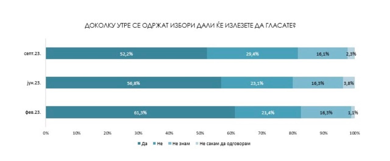 Повеќе од половина или 52,2% од испитаниците би излегле да гласаат доколку утре се одржат избори. Споредено со одговорите на испитаниците од истражувањата во јуни и февруари 2023 година се забележува тренд на намалување на бројот на испитаници кои се изјасниле дека ќе излезат на следните избори.