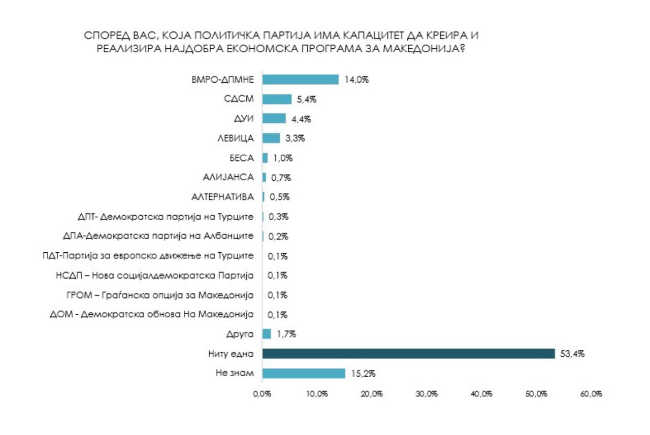 Повеќе од половина од испитаниците сметаат дека ниту една од постојните партии нема капацитет да реализира најдобра економска програма. Сепак, најголем дел од граѓаните имаат доверба дека тоа може да го стори ВМРО-ДПМНЕ.