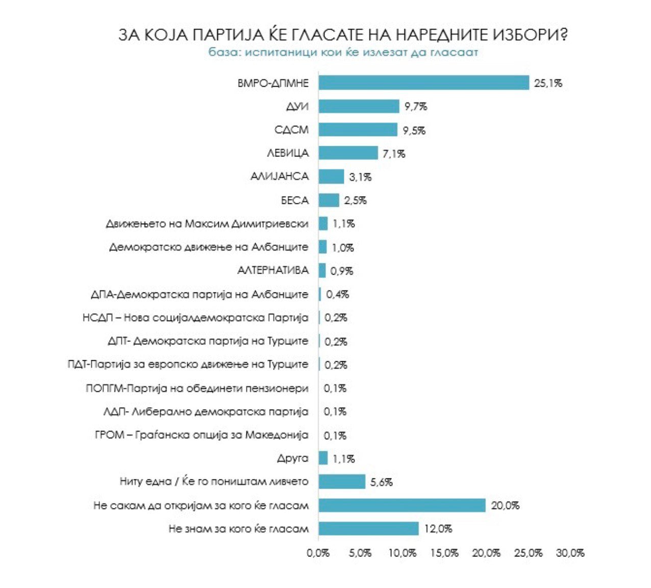 Една четвртина од испитаниците изјавиле дека на наредните избори ќе гласаат за политичката партија ВМРО- ДПМНЕ (25,1%), потоа следуваат ДУИ со 9,7%, СДСМ со 9,5% и Левица со 7,1%.