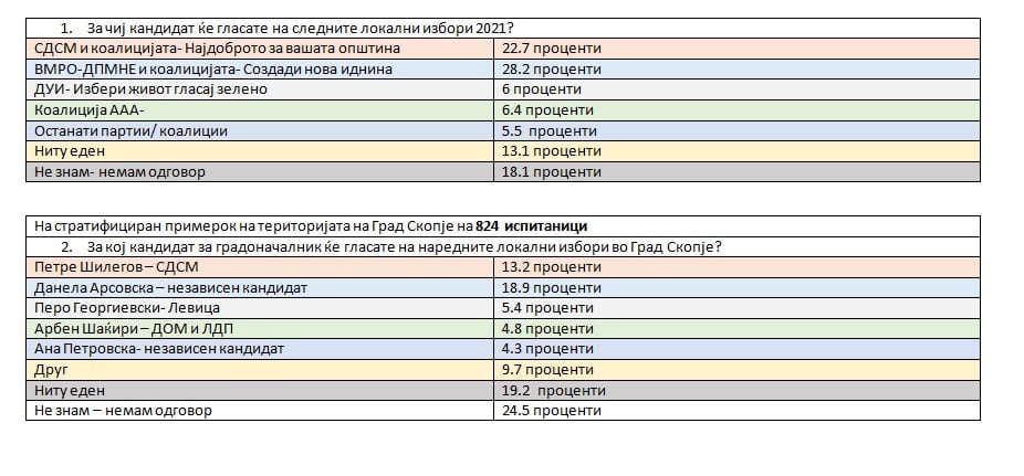 Кој ќе биде иден градоначалник на Скопје? Според анкетата тоа ќе биде Данела Арсовска која има голема предност пред Петре Шилегов од СДСМ. За Данела Арсовска би гласале 18,9% а за Петре Шилегов само 13,2% од скопјани.