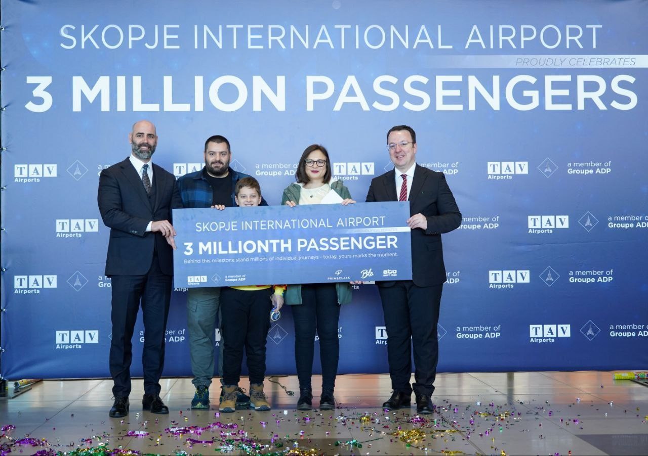 На семејство кое патуваше од Скопје за Бари како избран три милионитот патник, вицепремиерот Николоски и директорот на ТАВ, Неџат Курт му врачија честитики и симболична награда од ТАВ Македонија.