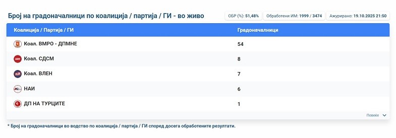 54 кандидати на ВМРО-ДПМНЕ и коалицијата се во водство во првиот круг од локалните избори, според обработени 51,48 проценти од гласовите од страна на Државната изборна комисија.