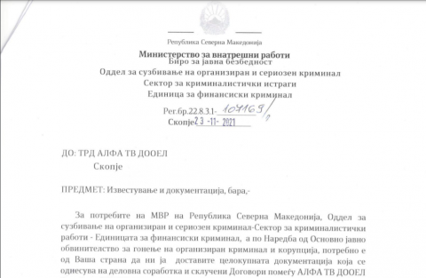 Почитувани гледачи на Алфа Телевизија, почитувани граѓани на Македонија, ве информираме дека “Министерството за внатрешни работи – Биро за јавна безбедност” денеска повторно направи ненајавен упад во Националната Телевизија Алфа со барања за доставување на Документација, Договори за соработка од било каков облик, Договори за емитување на рекламни спотови, web дизјан, припрема на web страна. Барањето е надополнето со достаување докази дека сме извршувале услуги од областа на рекламирањето, маркетингот и адвертајзингот!? А што друго впрочем јавно работи Алфа Телевизија?! Произведува програма и емитува реклами! Барањата се однесуват за национална телевизија која 24 часа, седум дена во неделата, 365 денови во годината продуцира и дистрибуира програма во рекламен простор од 12 минути на секој час програма. Тој визуелно и аудитивно присутен факт во домовите на граѓаните во Македонија и ширум светот, може многу едноставно да го утврди и министерот Оливер Спасовски со едноставно броење на телевизиското време на Алфа Телевизија во само 60 минути. И да утврди дека барањата на неговите агенти се бесмислени!