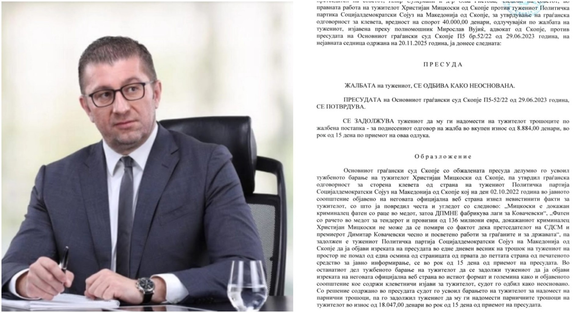 Премиерот Христијан Мицкоски денеска на својот фејсбук-профил објави пресуда на Апелацискиот суд Скопје, со која се потврдува одлуката на Основниот граѓански суд за тужба која тој ја поднел против Социјалдемократскиот сојуз (СДСМ) за клевета, изнесена во соопштение на партијата од 2 октомври 2022 година.