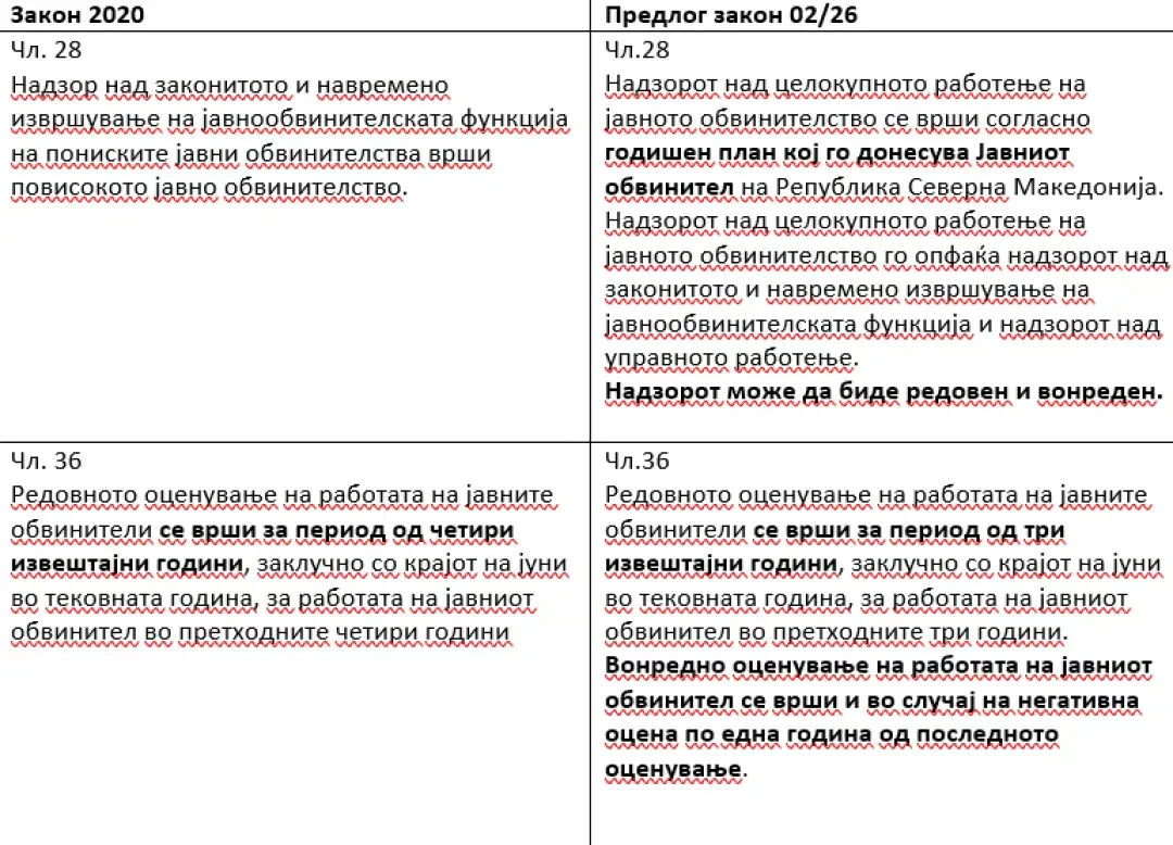 Оценувањето на обвинителите, пак, наместо на четири, ќе се врши на три години. Обвинителот кој за својата работа ќе добие негативна оценка, по една година повторно, вонредно, ќе биде оценуван.