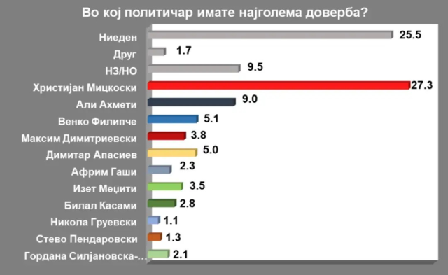 Според истражувањето на ИПИС, на прашањето „Во кој политичар имате најголема доверба?, кај 27,3 проценти од испитаниците одговорот е Христијан Мицкоски, додека 25,5 проценти дале одговор – ниеден, а 9,5 проценти не знаат или немаат одговор. Девет проценти имаат најголема доверба со лидерот на ДУИ Али Ахмети, 5,1 процент во претседателот на СДСМ Венко Филипче, 5 проценти во Димитар Апасиев од Левица, 3,8 проценти Максим Димитриевски. Следуваат со 3,5 проценти Изет Меџити, 2,8 проценти Билал Касами, 2,3 процент Африм Гаши, 2,1 процент претседателката Гордана Сиљановска Давкова, 1,3 проценти поранешниот претседател Стево Пендаровски, 1,1 процент поранешниот премиер Никола Груевски.