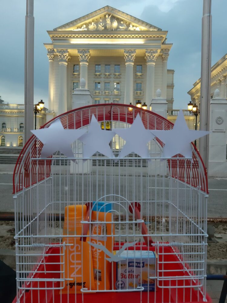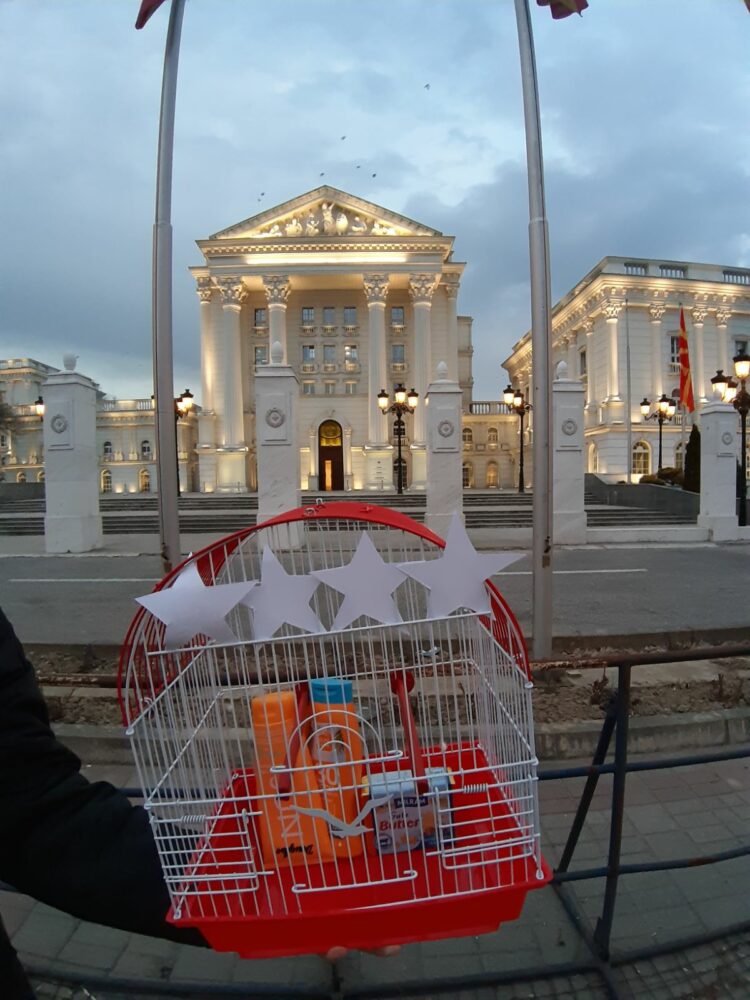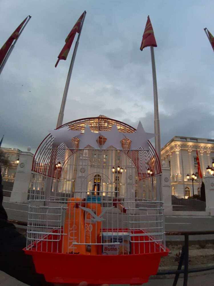 Во акцијата младите на ВМРО-ДПМНЕ оставија пред објектот на владата кафез со 4 ѕвезди со крема за сончање и путер.